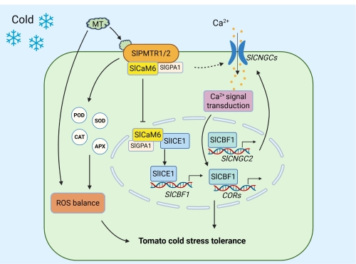 该研究揭示了一条由褪黑素受体介导的完整的番茄耐冷信号通路“SIPMTRs–SICaM6–SIICE1”,将褪黑素感知与经典冷胁迫响应直接关联。这一发现加深了我们对褪黑素生理功能的认知,为外源调节剂提高番茄耐冷能力提供了理论依据。