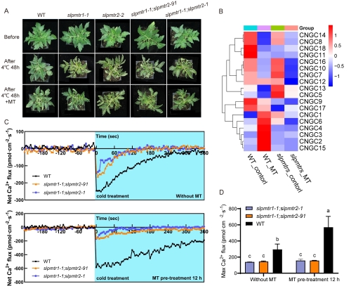 该论文在前期鉴定出的番茄褪黑素受体SlPMTR1/2基础上,进一步揭示了褪黑素作为信号分子在调控番茄耐冷方面从受体感知到转录调控的重要功能。当位于细胞膜的SIPMTR1/2蛋白感知到褪黑素信号,会启动下游信号转导,借由第二信使钙离子信号通路激活ICE1-CBF转录调控通路,显著提升番茄的耐冷能力。Ca2+作为一种通用的第二信使,在植物冷诱导的信号转导中起着关键作用。研究发现褪黑素能够以SIPMTR1/2依赖方式促进番茄在冷刺激下的钙离子内流,并上调环核苷酸门控通道SICNGC的表达,放大钙信号。缺失功能的slpmtr1/2突变体在低温下出现严重萎蔫和叶片卷曲,叶片中ROS与丙二醛(MDA)大量积累,整体耐冷性显著降低。