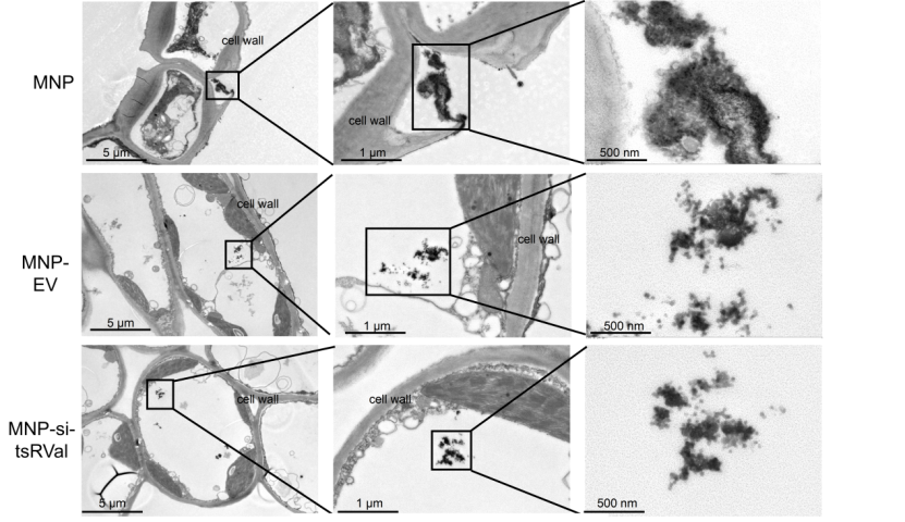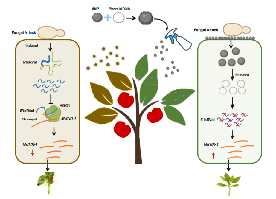 该研究通过small RNA测序获得一个tRNA衍生小RNA,tsRVal,在感病品种中接种苹果斑点落叶病(ALT1)、炭疽叶枯病(GLS1)和褐斑病(MLS1)诱导其富集,tsRVal结合苹果AGO1蛋白靶向苹果抗病基因MdTIR-1,调控苹果早期落叶病抗性。利用tsRVal序列设计并构建抑制 tsRVal 积累的artificial miRNA(si-tsRVal)载体,结合Fe3O4磁性纳米颗粒(MNPs)制备纳米抗病药剂,通过叶面喷施的方式,高效将 si-tsRVal 质粒递送进入苹果叶片细胞。