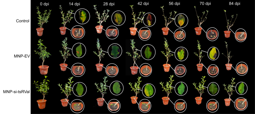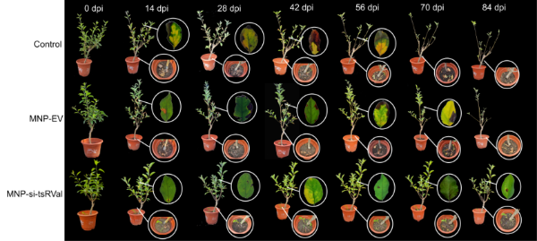 除对组培苗喷施试验外,本研究进一步在盆栽幼苗与大田成树两个维度开展了MNP–si-tsRVal复合物抗病性验证试验。结果显示,经MNP–si-tsRVal复合物喷施试验组植株发病和落叶情况明显优于对照组(Control和MNP–EV),MNP–si-tsRVal复合物能够有效增强苹果植株对早期落叶病的抗性,显著抑制病害的发生与发展,且具备长效防控效果。