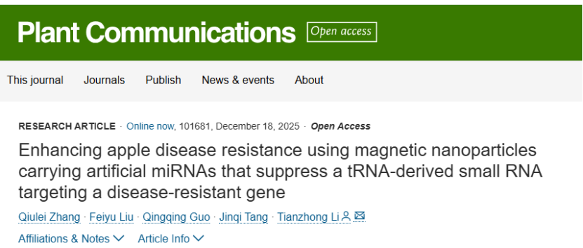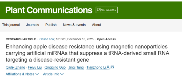 2025年12月17日,太阳成集团tyc33455李天忠教授领衔团队在Plant Communications 在线发表了题为Enhancing apple disease resistance using magnetic nanoparticles carrying artificial miRNAs that suppress a tRNA-derived small RNA targeting a disease-resistant gene的研究论文,利用苹果 tRNA 衍生小 RNA(tsRVal)序列设计并构建抑制 tsRVal 积累的artificial miRNA(si-tsRVal)载体,结合Fe3O4磁性纳米颗粒(MNPs)制备纳米抗病药剂,通过叶面喷施方式,高效将 si-tsRVal 质粒递送进入苹果叶片细胞,增强苹果叶部病害抗病能力,达到长效绿色防控效果,升级果树综合抗病防线。