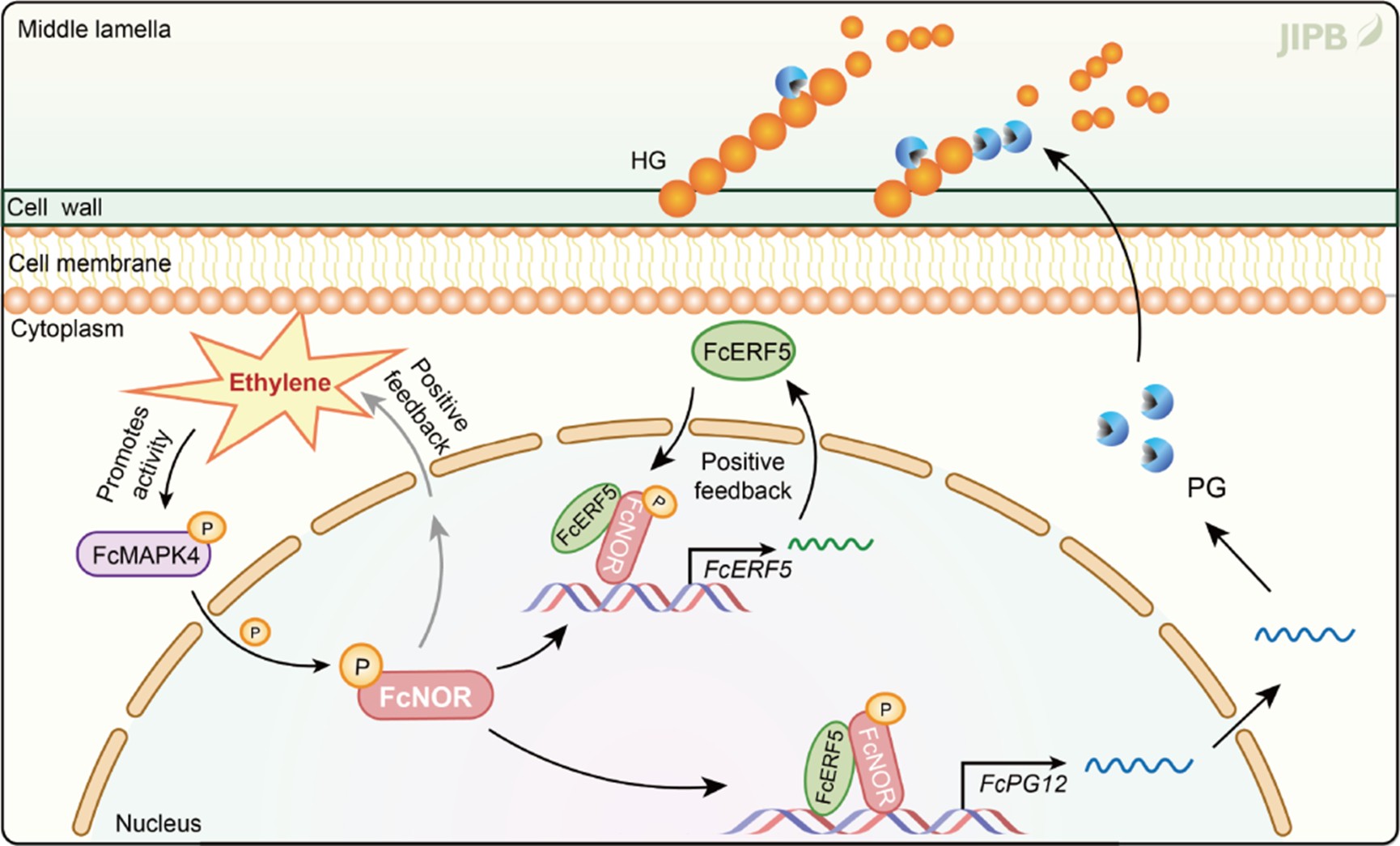 此外, FcNOR还能够结合并激活乙烯响应因子FcERF5的表达, 同时两者在蛋白水平形成互作, 建立了一个强有力的正反馈环路。这种协同互作使得该复合体对FcPG12表达的转录激活作用被显著放大。