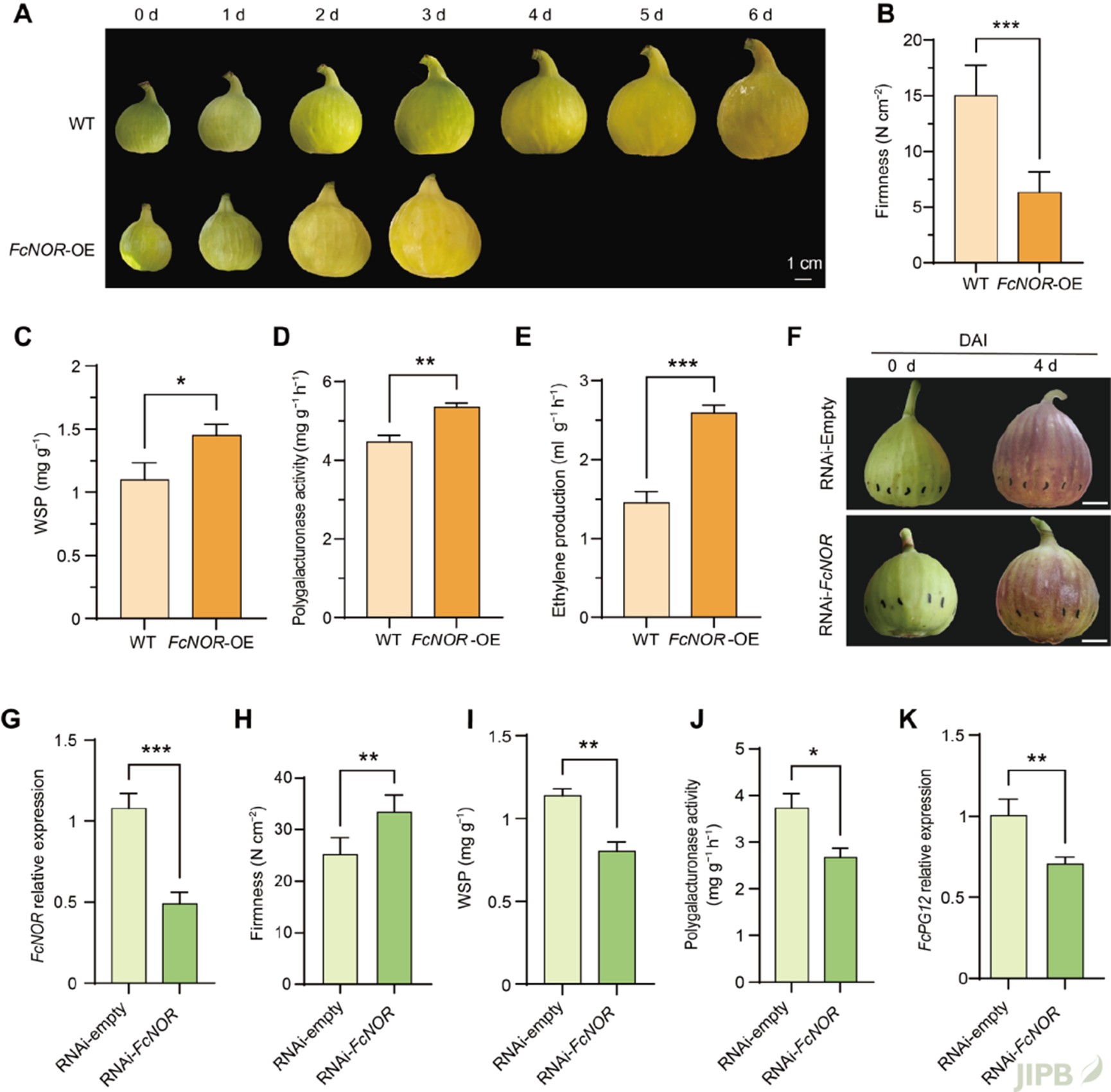 研究团队首先通过生理生化与表型分析确认, 无花果果实在成熟过程中的快速软化主要归因于细胞壁果胶的降解, 而多聚半乳糖醛酸酶基因FcPG12是驱动这一过程的关键靶标。为了解析FcPG12激增的调控机制, 研究人员开展了深入探讨, 鉴定出核心调控因子FcNOR。团队发现, 作为一个NAC转录因子, FcNOR能直接结合到FcPG12的启动子区域并激活其转录, 从而正向调控果实的成熟与软化 (图1)。