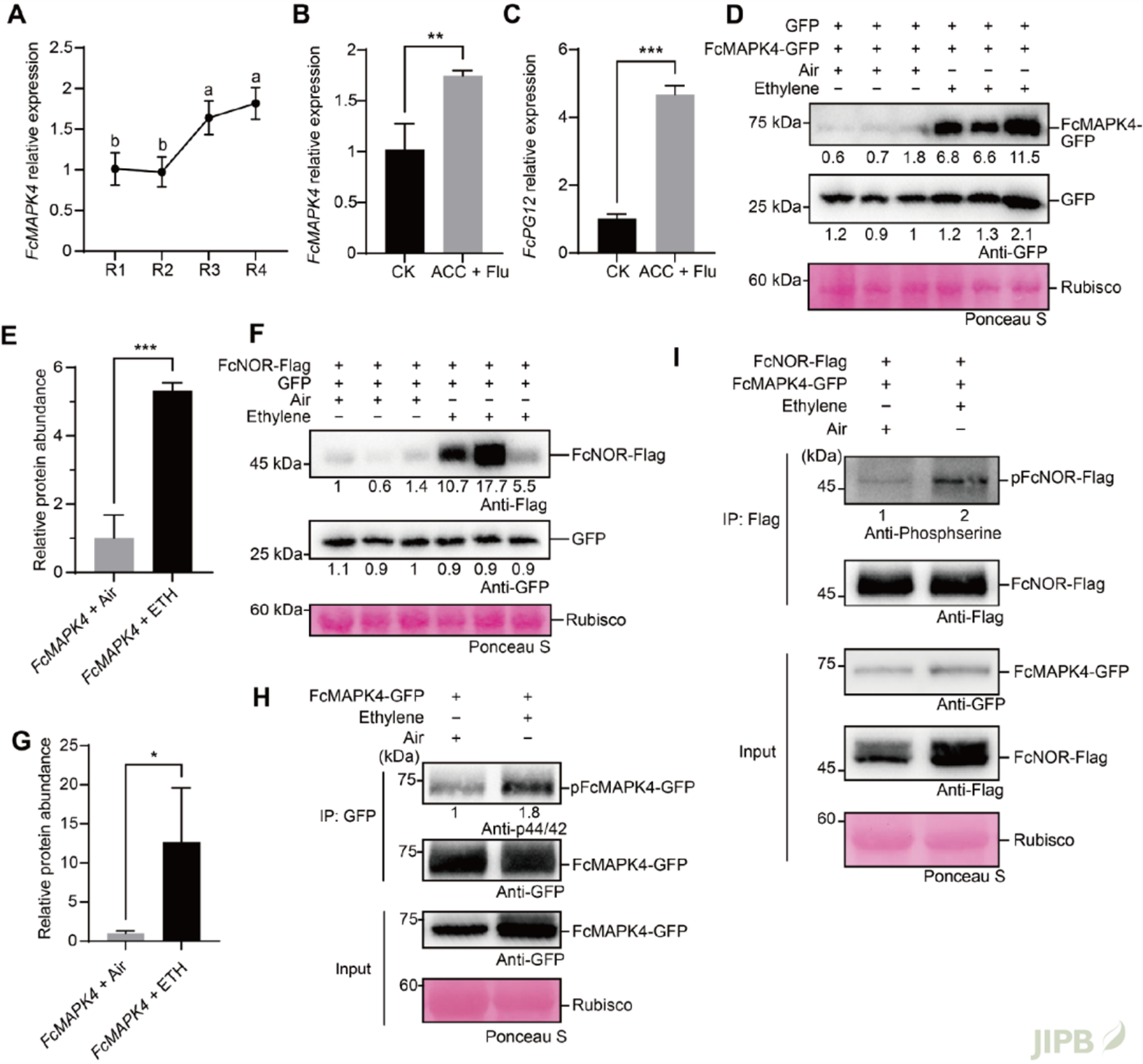 图3 乙烯促进FcMAPK4和FcNOR蛋白的积累, 并增强FcMAPK4及FcNOR的磷酸化程度