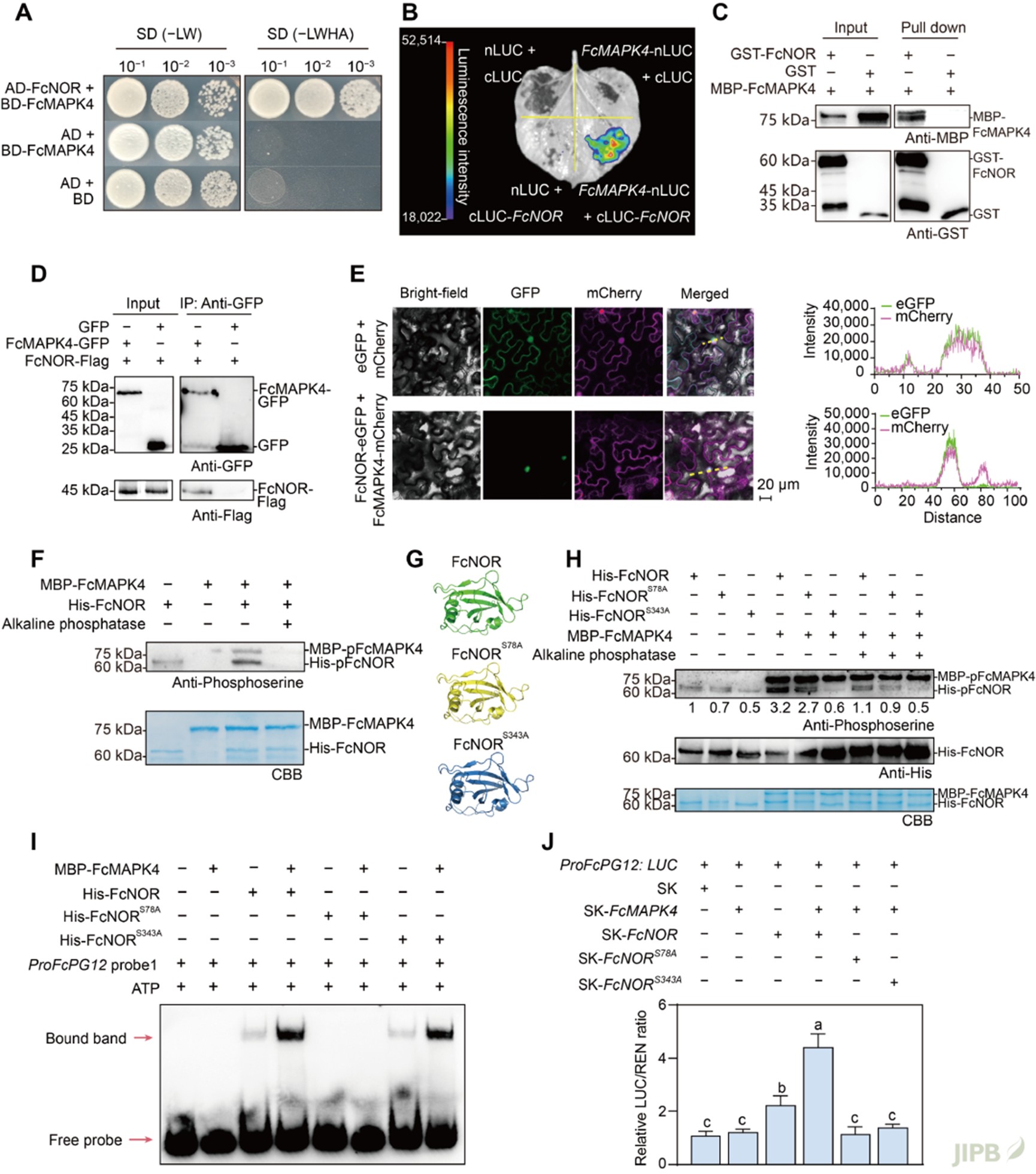研究发现, 激酶FcMAPK4能够与FcNOR发生物理互作, 并对其关键位点Ser-78和Ser-343进行磷酸化修饰。其中, Ser-78位点的磷酸化增强了FcNOR的DNA结合亲和力, 而Ser-343位点则决定了其转录激活能力 (图2)。