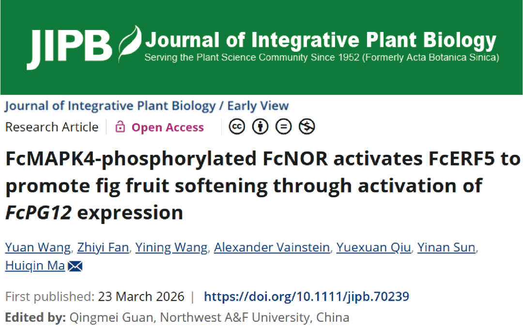 近日, 太阳成集团tyc33455马会勤团队在JIPB在线发表了题为“FcMAPK4-phosphorylated FcNOR activates FcERF5 to promote fig fruit softening through activation of FcPG12 expressio”的研究论文。该研究深入揭示了由FcMAPK4介导的磷酸化级联反应和FcNOR-FcERF5转录因子复合体协同调控无花果果实成熟期快速软化的全新分子网络。