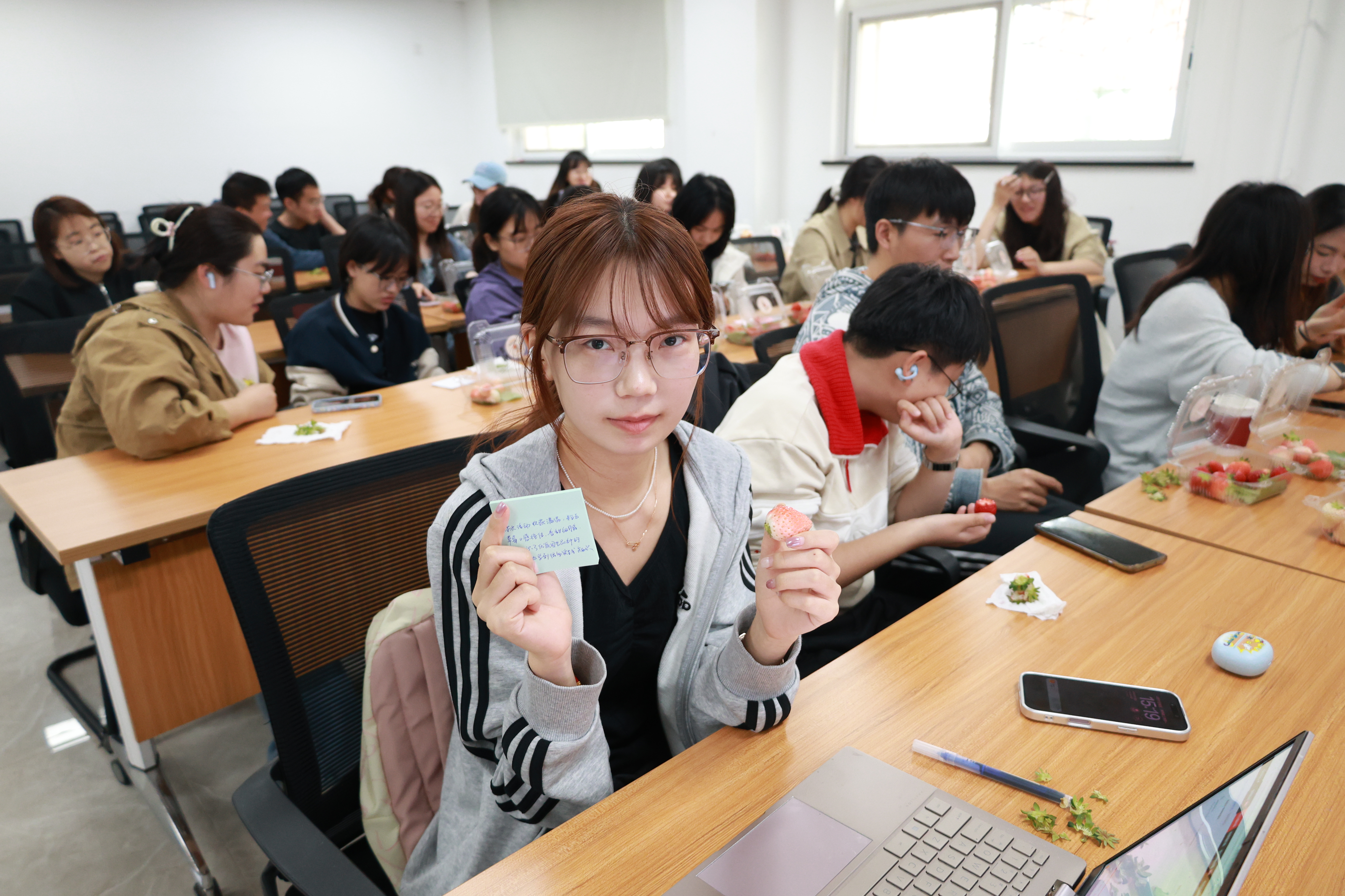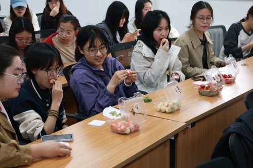 在草莓品鉴环节,刘香萍带来了农场产出的红颜、粉玉、建德白露、宝珠、圣诞红等五个特色品种,逐一讲解各品种的生长特性与口感差异。同学们踊跃品尝,认真写下品鉴感想,并投票选出了心目中口感最佳的草莓品种。一颗颗饱满鲜亮的草莓承载着校友对园艺事业的执着,也展示着农大学子在农业创业道路的不懈奋斗。